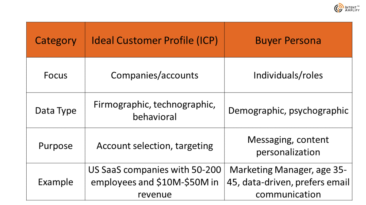 An ICP is the kind of company that best suits your solution, and a buyer persona is the individual decision-makers in that company. Blending both creates a situation of reaching the right person in the wrong company or the wrong person in the right company, resulting in reduced conversion rates.